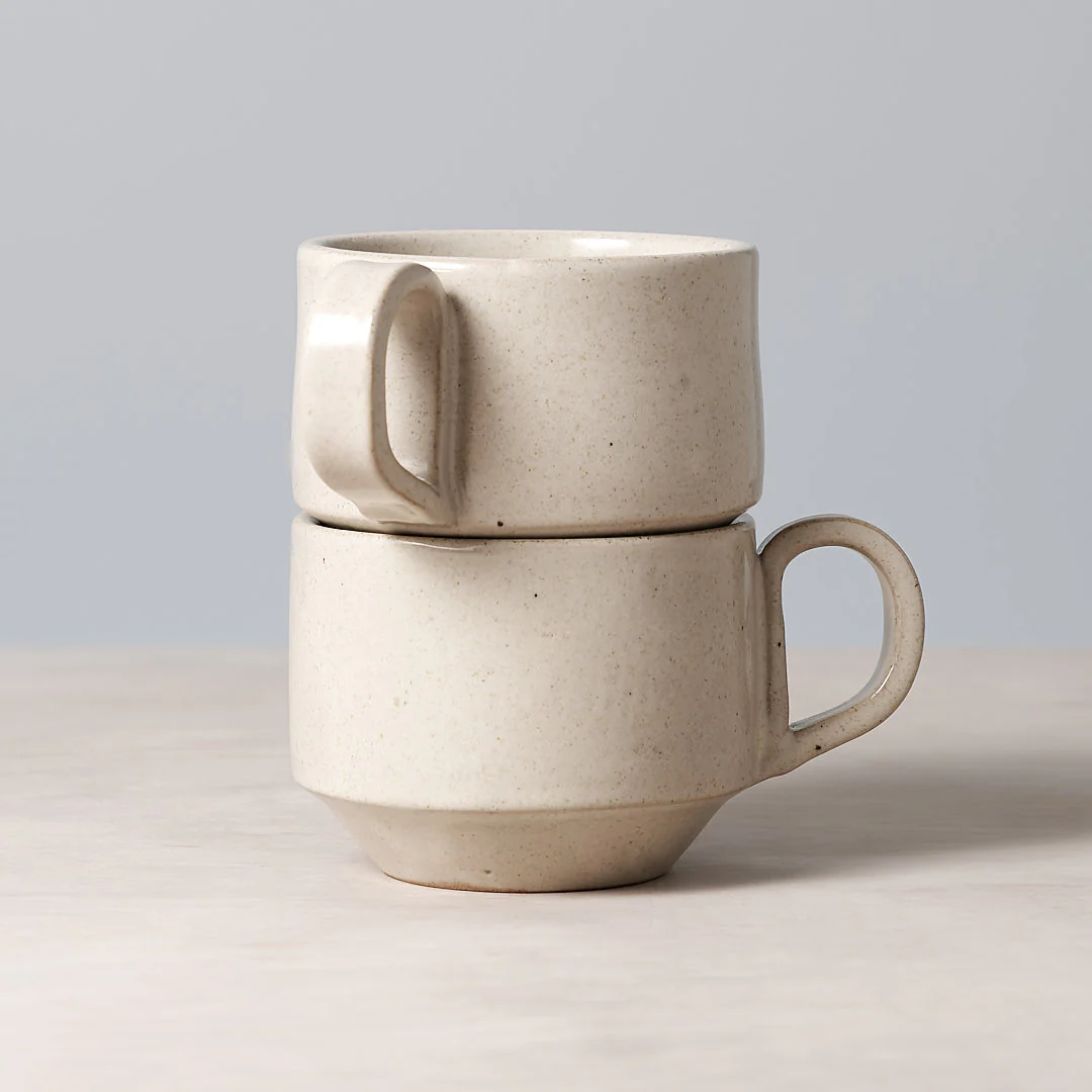 A hand-thrown ceramic stacking mug, in a beige glaze. Made from an iron-bearing buff clay body that reveals a light speckle.